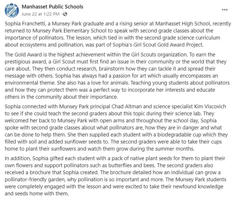 Working closely with a conservationist at the Science Museum of Long Island, we created a perineal pollinator garden, establishing a robust habitat for bees, butterflies and other endangered pollinators. After learning how to create a successful garden, I engaged with my community through various events and presentations. I shared the invaluable knowledge I gained to raise awareness and inspire others to join me in safeguarding these vital creatures by planting perineal plants at home and in greenspaces around their community.